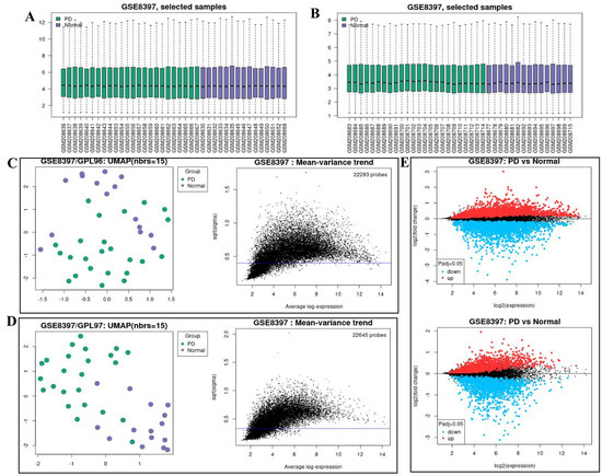 Gene chip data information. (A) PD sample information from the GPL96 platform in the GSE8397 dataset. (B) Sample information from the GPL96 platform in the GSE8397 dataset. (C) PCA and mean-variance trend in PD compared with the normal controls of GPL96 platform. The blue line is constant variance approximation. (D) PCA and mean-variance trend in PD compared with the normal controls of GPL97 platform. The blue line is constant variance approximation. (E) Volcano map of differential genes. Blue represents low expression and red represents high expression. p-value < 0.05.