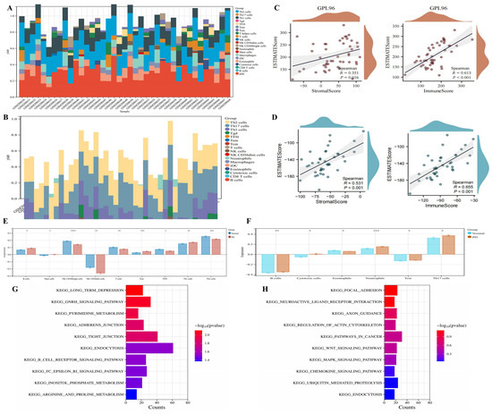 Immune infiltration analysis and GSEA of differential genes. (A) Heatmap of immune infiltration analysis in the GPL96 platform. (B) Heatmap of immune infiltration analysis in the GPL97 platform. (C) The correlation between the estimated scores and the stromal scores or immune scores in the GPL96 platform. (D) The correlation between the estimated scores and the stromal scores or immune scores in the GPL97 platform. (E) Boxplot of differentially expressed immune cells in the GPL96 platform. (F) Boxplot of differentially expressed immune cells in the GPL97 platform. (G) GSEA enrichment analysis of the GPL96 platform. (H) GSEA enrichment analysis of the GPL97 platform. Compared with normal controls, * p < 0.05, ** p < 0.01, *** p < 0.001, **** p < 0.0001.