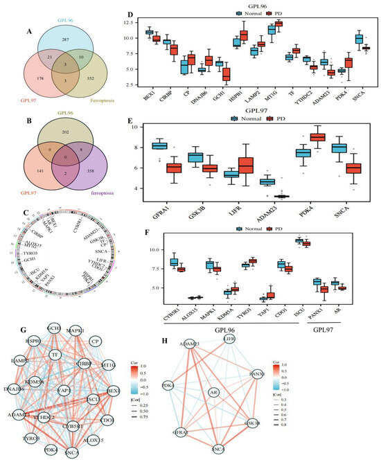 Correlation analysis of differentially expressed genes and ferroptosis-related genes. (A) Venn diagram of DEGs and FRGs showed that there were 3 overlapping genes between GPL96 platform, GPL97 platform, and FRGs, GPL96 and FRGs intermingled 10 genes separately, and GPL97 and FRGs intermingled 3 genes separately. (B) In Venn diagram, 8 genes and 2 genes were overlapping between ferroptosis and GPL96 and GPL97 platform of WGCNA, respectively. (C) The gene is located on the chromosome. (D) DEFRGs in GPL96 platform gene expression in PD compared with normal controls. (E) DEFRGs in GPL97 platform gene expression in PD compared with normal controls. (F) Gene expression differences in the GPL96 and GPL97 platform of WGCNA. (G) Correlation of DEFRGs in GPL96 platform. (H) Correlation of DEFRGs in GPL97 platform. Red represents positive correlation, and blue represents negative correlation. The stronger the inter-gene correlation, the thicker the line segment.