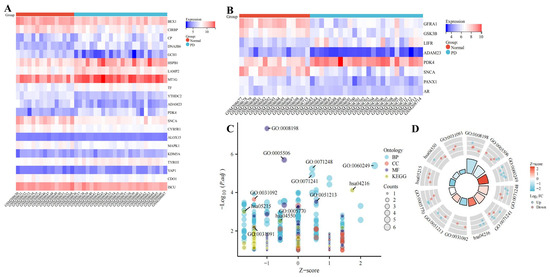 Differential gene analysis. (A) Gene heat map from GPL96 platform. (B) Gene heat map from GPL97 platform. Red represents high expression, and blue represents low expression. (C,D) Biological function and KEGG enrichment analysis, BP: GO:0060249: HSPB1/LAMP2/PDK4/TF/TYRO3/YAP1; GO:0071248: MT1G/SNCA/TF/ALOX15/MAPK1; GO:0071241: MT1G/SNCA/TF/ALOX15/MAPK1; CC: GO:0031092: SNCA/CYB5R1; GO:0005770: LAMP2/TF/GFRA1/MAPK1; GO:0031091: SNCA/CYB5R1; MF: GO:0008198: SNCA/TF/CDO1/ISCU; GO:0005506: SNCA/TF/ALOX15/CDO1/ISCU; GO:0051213: ALOX15/KDM5A/CDO1; KEGG: hsa04216: CP/TF/ALOX15; hsa05215: GSK3B/MAPK1/AR; hsa04550: GSK3B/LIFR/MAPK1.