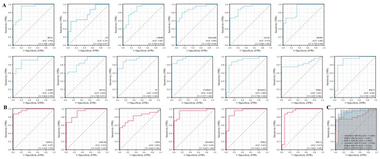 Diagnostic value of DEFRGs in (A) GPL96 platform, (B) GPL97 platform, and (C) combined gene analysis. ROC curves of BEX1, CIRBP, CP, DNAJB6, GCH1, HSPB1, LAMP2, MT1G, TF, YTHDC2, GFRA1, GSK3B, LIFR, ADAM23, PDK4, and SNCA.