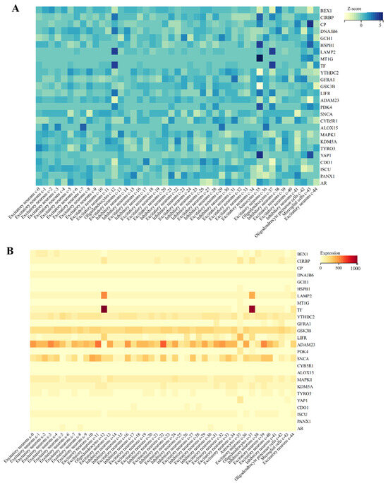 Single-cell sequencing analysis of DEFRGs. (A) Single-cell sequencing was used to analyze the expression of DEFRGs in the brain. (B) Expression Z-scores of DEFRGs in 44 cells in the brain.