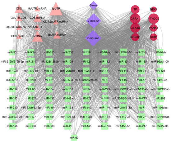 Coexpression network of diagnostic genes and target miRNAs. Red ellipses represent diagnostic genes, green quadrangles represent target miRNAs, pink triangle represent transcript regions, and blue quadrangles represent seed types.