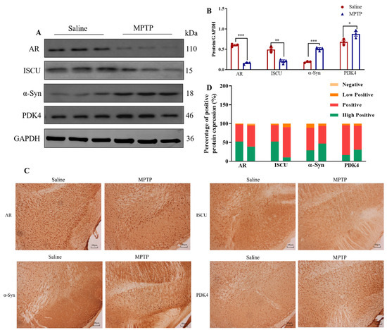 SN was homogenized with a Polytron in ice-cold RIPA buffer supplemented with PMSF (catalog#G2002 and #G2008, Servicebio, China), sonicated, and cleared by centrifugation (12,000× g, 10 min, at 4 °C). Protein concentration in the supernatant was determined by BCA assay and separated on SDS-PAGE gels and transferred onto nitrocellulose membrane (Millipore, IPFL00010, Germany) by electrophoresis. Blots were blocked in 5% nonfat milk in TBST for 1 h at room temperature and probed with primary antibody, including AR (1:1000, Affinity, Melbourne), ISCU (1:1000, Affinity, Melbourne), α-Syn (1:1000, Affinity, Melbourne), PDK1 (1:1000, Affinity, Melbourne), and GAPDH (1:3000, Affinity, Melbourne) in TBST with 1% nonfat milk overnight at 4 °C. After overnight incubation, this was followed by incubation with HRP-conjugated secondary antibody in TBST with 1% nonfat milk for 2 h at room temperature. The blots were developed using an Enhanced Chemiluminescence assay (BIO-Rad). Immunohistochemistry was performed on 30 μm thick serial brain sections. We used 1xCitrate Antigen Retrieval Solution, 98 °C for 10 min, 0.1% Triton X-100 transparent for 10 min, hydrogen peroxide for 20 min (dark), and blocked with 10% goat serum in PBS incubated with AR (1:200, Affinity, Melbourne), ISCU (1:200, Affinity, Melbourne), α-Syn (1:200, Affinity, Melbourne), and PDK1 (1:200, Affinity, Melbourne) antibodies overnight. Brain tissues were treated with appropriate biotin secondary antibody, followed by DAB Reagent Kit (catalog#G1212, Servicebio, China). Densitometry analysis was performed on scanned Western blot and immunohistochemistry images using the ImageJ software (https://imagej.net/software/imagej/, accessed on 14 June 2023).