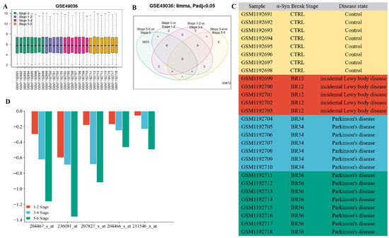 Validation of SNCA expression level in GSE49036 dataset (A) sample information of GSE49036 dataset. (B) A total of 3803 genes overlapped between stage 5–6 and stage 0. (C) The pathological stage of α-Syn in 28 samples was divided into Braak α-Syn stage 0 (Control); Braak α-Syn stage 1–2 (incidental Lewy body disease); Braak α-Syn 3–4 and Braak α-Syn stages 5–6 (PD), Orange represents control, red represents Braak α-Syn stage 1–2, blue represents Braak α-Syn 3–4, green represents Braak α-Syn stages 5–6. (D) Compared with stage 0, the expression differences of α-Syn in the 5 SNCA gene samples were more significant with the aggravation of pathological process, especially in stage 5–6.