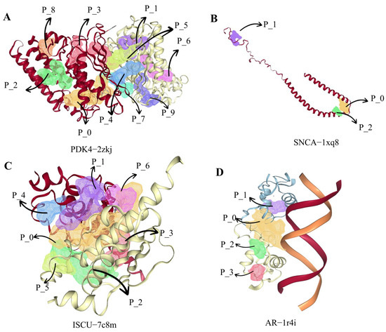 Prediction of protein-binding pockets with higher drug-binding scores, including (A) PDK4-2zkj, (B) SNCA-1xq8, (C) ISCU-7c8m, and (D) AR-1r4i.