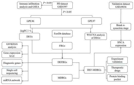 Gene expression analysis is becoming increasingly important in biological research. Several studies have utilized gene expression datasets downloaded from the Gene Expression Omnibus (GEO) database (https://www.ncbi.nlm.nih.gov/geo/, accessed on 27 May 2023) [15] to elucidate the biological mechanisms in the development of PD. The results of these bioinformatics analyses provide promising hints for understanding the molecular mechanisms underlying the pathogenesis of PD from different perspectives. However, no bioinformatics studies have focused on which ferroptosis-related genes (FRGs) and mitochondrial dysfunction-related genes (MDRGs) are critical for PD development. Therefore, in this study, weighted gene coexpression network analysis (WGCNA) was used to identify differentially expressed ferroptosis-related genes (DEFRGs) from 368 ferroptosis-related genes (FRGs) and PD patients from the GEO database. The DEFRGs with diagnostic values were analyzed by the receiver operating characteristic (ROC) curve (area under the curve, AUC > 0.700). Finally, the predicted protein-binding pocket of the DEFRGs was analyzed, and the best docking position was analyzed to provide a basis for new drug development.