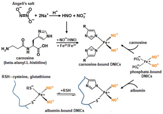 The class of NO-donor carnosine derivatives also includes DNICs associated with carnosine. We have previously shown that carnosine in the presence of the nitroxyl anion (NO−) and iron ions participates in DNIC formation [16]. In that work, Angeli’s salt (sodium trioxidinitrate) was the donor of HNO (the protonated form of the nitroxyl anion) (Figure 1). However, the interaction of carnosine DNICs with reactive oxygen species (ROS) has not yet been studied in contrast with that of thiol-containing DNICs. Importantly, in skeletal muscles and nervous tissue, carnosine is present at high (millimolar) concentrations [19,21].