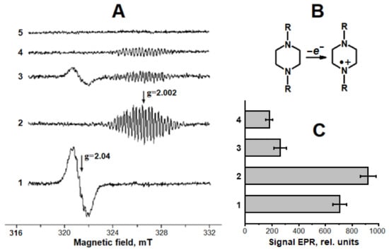 Interaction of carnosine DNICs with tert-butyl hydroperoxide (t-BOOH) and its effect on the formation of piperazine-derived cation radical. (A)—electron paramagnetic resonance (EPR) spectra of DNICs recorded after 12.5 min of incubating the reaction mixture containing 5 mM of Angeli’s salt, 1 mM of Fe3+, and 25 mM of carnosine (1); the same as (1), but without carnosine and 3 min after adding 4 mM of t-BOOH (2); the same as (1), 3 min after adding 4 mM of t-BOOH (3); 15.5 min incubation of the mixture containing only Angeli’s salt (4); and 3 min after mixing 1 mM of Fe3+ and 4 mM of t-BOOH (5). In all the cases, the reaction mixture contained 0.1 M of HEPES (pH 7.5). (B)—structural formula of piperazine cation radical. (C)—the intensity of EPR signals of piperazine cation radical: 1—reaction mixture contained Fe2+ ions and 4 mM of t–BOOH, and the spectra were recorded 3 min after mixing the components; columns 2–4 correspond to spectra 2–4 in panel (A).