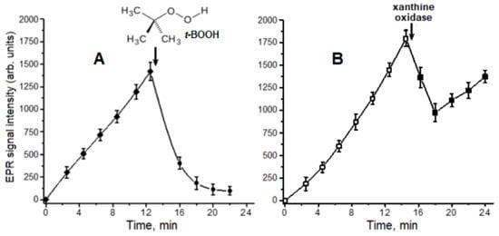 Kinetics of carnosine DNIC formation, and the effects of t-BOOH addition to the reaction mixture (A) or enzymatic generation of superoxide radical (B) on DNIC level. The reaction mixture contained 0.1 M of HEPES buffer, 5 mM of Angeli’s salt, 1 mM of Fe3+, and 25 mM of carnosine. (A)—after 12.5 min incubation, 4 mM of t-BOOH was added to the mixture, and the structural formula of t-BOOH is also shown; (B)—reaction mixture also contained 1.5 mM of xanthine. After 14.5 min of incubation, xanthine oxidase (0.6 U/mL) was added to the mixture.