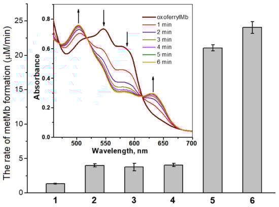 The rate of oxoferrylmyoglobin (oxoferrylMb) reduction to metmyoglobin (metMb) by DNICs with phosphate and carnosine ligands and by their decay products (NO2− and Fe2+ ions). The reaction mixture: 0.1 M of HEPES (pH 7.5) and 92 μM of oxoferrylMb. 1—control (without additives). Additives: 2—0.5 mM of FeSO4; 3—1 mM of NaNO2; 4—1.25 mM of carnosine; 5—0.5 mM of carnosine-bound DNICs (obtained by blending 1.25 mM of carnosine with 0.5 mM of phosphate-bound DNICs); and 6—0.5 mM of phosphate-bound DNICs. Inset—absorption Mb spectra during the reduction of oxoferrylMb to metMb under the action of 0.5 mM of carnosine DNICs. The arrows indicate the decreases (556 and 583 nm) and increases (503 and 631 nm) in oxoferrylMb’s and metMb’s characteristic maxima.