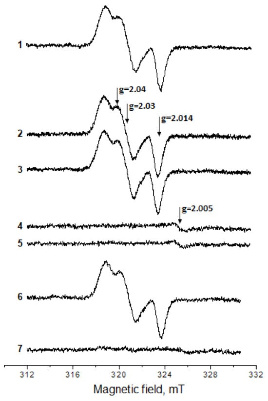 EPR spectra of the products of BSA-DNICs’ and metMb’s interactions with H2O2 or t-BOOH. The reaction mixture: 150 mM of Na,K-phosphate buffer (pH 7.4) and 360 μM of BSA-DNICs (1); same as (1) + 2.5 mM of H2O2 (2); same as (2) + 1 mM of DTPA (3); same as (3) + 100 μM of metMb (4); the reaction mixture contained only H2O2 and metMb (5); the same as (1) + 1 mM of DTPA + 2 mM of t-BOOH (6); and the same as (6) + 100 μM of metMb (7). The EPR spectra were recorded 4 min after all the components were mixed.