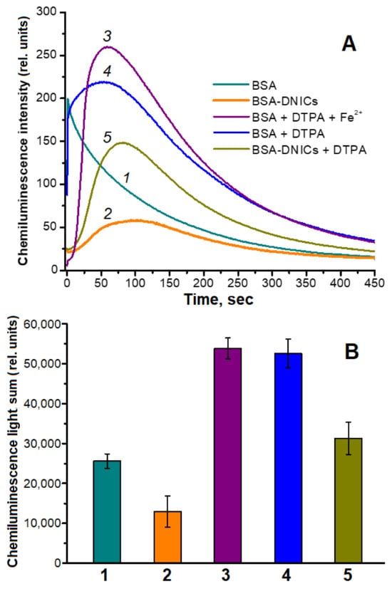 The antioxidant effect of BSA-DNICs in a system modeling metMb peroxidation was studied using luminol-dependent chemiluminescence. In the BSA-DNICs-containing reaction mixture, the complexes significantly decreased the maximum intensity of chemiluminescence induced by metMb oxidation with t-BOOH (Figure 6A, curves 1 and 2). Likewise, in the presence of BSA-DNICs, the chemiluminescence light sum was two times lower than that in the sample with albumin (Figure 6B, columns 1 and 2). In addition, the kinetic chemiluminescence curve of the samples with BSA-DNICs had an induction period characteristic of many antioxidants [9,60]. These results indicate that BSA-DNICs effectively neutralized the pro-oxidants formed. Adding DTPA to the reaction mixture increased the chemiluminescence light sum (Figure 6B, columns 4 and 5). Analyzing the chemiluminescence kinetic curves allowed us to conclude that in the presence of the metal-ion chelator, the pro-oxidants were generated at a lower rate. Nevertheless, the antioxidant effect of BSA-DNICs in the system with DTPA remained (Figure 6B columns 4 and 5). Under these conditions, BSA-DNICs reduced the chemiluminescence light sum by 1.7 times. At the same time, the DTPA complexes with Fe2+ still participated in the generation of free radicals, interacting with t-BOOH (Figure 6A, curve 3), although the rate of this reaction was lower than in the cases of albumin-bound or free iron. Along with the dopant iron, the one released during the decay of Mb and DNICs hemes could have influenced the reaction in our experiments.