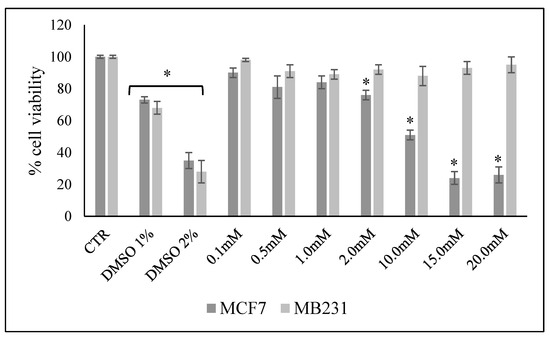Therefore, for the subsequent experiments, we chose a dose that did not affect cell viability (0.1 mM) and one that reduced viability by 50% (10 mM) in MCF7. For comparison, we used the same doses to assess any molecular effects in MB231.
