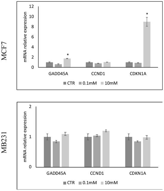We then sought to determine whether the low viability of MCF7 cells induced by high doses of VitC was accompanied by changes in the expression of genes involved in cell proliferation such as CCND1, CDKN1a, GADD45A (Figure 2). The results showed that 10 mM VitC was able to overexpress the gene for the cyclin-dependent kinase inhibitor (CDKN1a) and much more the gene for the protein responsible for growth arrest and DNA damage (GADD45A) only in MCF7 cells. The expression of CCND1, which encodes for cyclin D1 that stimulates the G1/S transition of the cell cycle, remained unchanged.