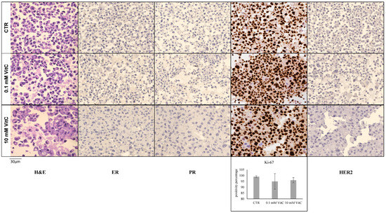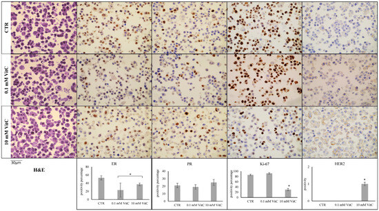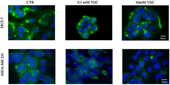 Once the effects of 0.1 mM and 10 mM VitC on cell viability and cell cycle genes had been established, the phenotype of MCF7 and MB231 cells was analyzed using ER, PR, Ki67, and HER2 antibodies by immunocytochemistry. ER and PR positivity and HER2 negativity in MCF7 control cells and triple negativity in MB231 control cells were confirmed [26,28]. Twenty-four hours after treatment with VitC 0.1 mM and 10 mM, MCF7 cells showed a significant reduction in the level of ER expression (Figure 3). HER2 was upregulated with 10 mM VitC. The downregulation of Ki67 with 10 mM VitC was linked to the reduction of cell viability reported in Figure 1.