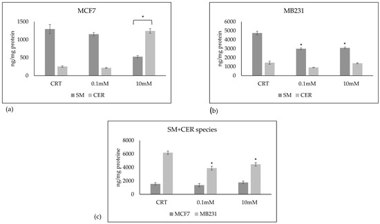 Sphingomyelin (SM) and ceramide (CER) species in MCF7 (a,b) and MB231 (c,d) cells treated with 0.1 mM and 10 mM VitC. Data are expressed as the mean ± SD of 3 independent experiments performed in duplicate. * p < 0.05 versus control sample (CTR).