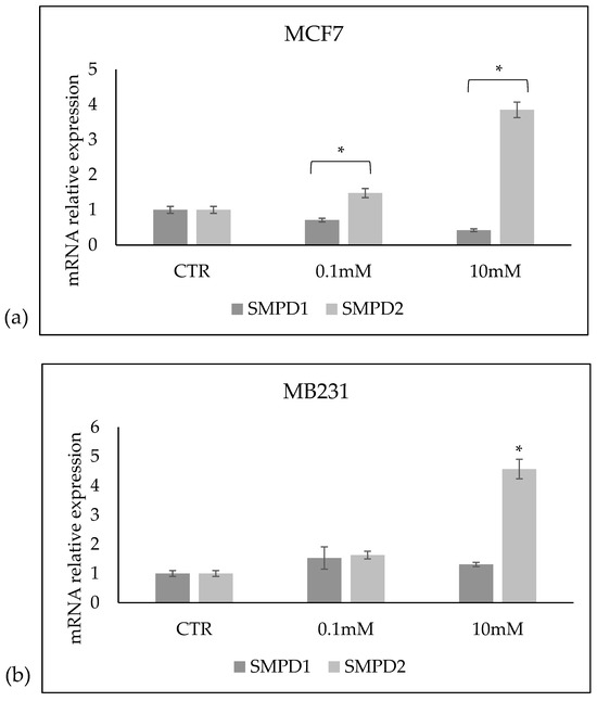 Effect of 0.1 mM and 10 mM Vitamin C on the gene expression of SMPD1 coding for acid sphingomyelinase and SMPD2 coding for neutral sphingomyelinase 1 in (a) MCF7 and (b) MB231 cells. GAPDH and 18S rRNA were used as housekeeping genes. mRNA relative expression levels were calculated as 2−ΔΔCt, comparing the results of the treated samples with the control sample (CTR) equal to 1, the origin of the axes. Data are expressed as the mean ± SD of 3 independent experiments performed in duplicate. * p < 0.05 versus CTR.