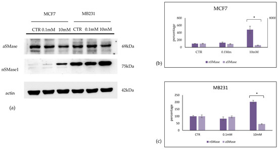 Effect of 0.1 mM and 10 mM Vitamin C on acid sphingomyelinase (aSMase) and neutral sphingomyelinase1 (nSMase) in MCF7 and MB231 cells. (a) Western blotting panel of aSMase and nSMase1 and actin as reference; (b) densitometric analysis of MCF7, the values were normalized with actin and were expressed as a percentage of the control sample (CTR). (c) densitometric analysis of MB231, the values were normalized with actin and were expressed as a percentage of the control sample (CTR). Data are expressed as the mean ± SD of 3 independent experiments performed in duplicate. * p < 0.05 versus CTR.