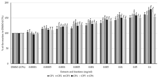 All extracts and fractions enhanced the spontaneous contractility of the longitudinal smooth muscle of the swine colon in a dose-dependent manner (Figure 3). Among the extracts, the aqueous extract (CP3) exhibited the strongest myocontractile effect (Figure 3). For the fractions, it is impossible to clearly indicate the one that exhibited the strongest myocontractile effect. The magnitude of the reaction differed between fractions and concentrations (Figure 3). CP1 exhibited a significant myocontractile effect on the longitudinal smooth muscle of the colon in a dose range of 0.00005–0.1 mg/mL. The response ranged from 114.42 ± 5.08 to 161.62 ± 6.21% of the reaction to DMSO (0.5%) for 0.00005 and 0.1 mg/mL CP1, respectively. CP2 also caused a clear dose-dependent enhancement of spontaneous muscle activity, although the effective dose range was slightly narrower, starting at a dose of 0.0001 mg/mL. The highest magnitude of contractile response was noted when a dose of 0.1 mg/mL was used and reached 159.67 ± 7.93% of the control reaction. Utilising CP3 caused the strongest contraction of the smooth muscle of the colon among all the extracts. The reaction ranged from 116.95 (5.38%) to 175.39 (5.38%) of the smooth muscle reaction to DMSO (0.5%) when the extract was applied at concentrations of 0.00005 and 0.1 mg/mL, respectively (Figure 3). CP4 produced a dose-dependent myocontractile effect on the colon specimens if administered in a concentration range of 0.0001–0.1 mg/mL. The reaction ranged from 121.68 (2.77%) to 178.37 (8.29%) of the control reaction. CP5 also enhanced the magnitude of the spontaneous motor activity, and the minimum dose to achieve a significant change in spontaneous contractility was 0.00005 mg/mL. The reaction ranged from 113.97 (6.09%) to 168.69 (11.90%) of the smooth muscle reaction to the vehicle at 0.00005 and 0.1 mg/mL, respectively. For CP6, the lowest dose inducing a significant myocontractile effect was 0.0001 mg/mL, and the reaction amounted to 122.57 ± 4.14% of the control reaction. The highest magnitude of contractile response was noted when CP6 was administered at a dose of 0.1 mg/mL (153.58 ± 5.62% of the reaction to DMSO, 0.5%).