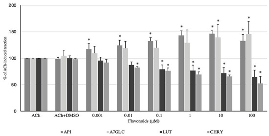 The effect of apigenin (API), apigenin 7-O-glucuronide (A7GLC), luteolin (LUT), and chrysoeriol (CHRY) on the ACh-induced activity of swine isolated colonic longitudinal smooth muscle. The results are expressed as % of ACh-induced contraction. The results are expressed as mean of 5 independent experiments (±SD); p ≤ 0.05 vs. DMSO (0.5%); * p ≤ 0.05 vs. ACh (10 μM).