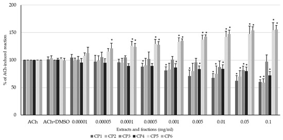 The effect of methanolic extract (CP1), 50% methanolic extract (CP2), aqueous extract (CP3), ether residue (CP4), acetate residue (CP5), and n-butanol residue (CP6) of C. palustre on the spontaneous activity of swine isolated colonic longitudinal smooth muscle. The results are expressed as % of the response to DMSO (0.5%). The results are expressed as mean of 5 independent experiments (±SD); p ≤ 0.05 vs. DMSO (0.5%); * p ≤ 0.05 vs. DMSO (0.5%).