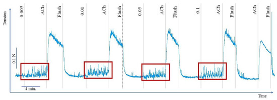 Sample recordings of porcine colon specimens’ response to aqueous extract of C. palustre (CP3)—significant increase in the spontaneous contractility. ACh—acetylcholine, Flush—flushed with fresh modified Krebs–Henseleit Solution. The blue line indicates the motoric activity of colon smooth muscle. The elements framed in red indicate remarkable increase of the spontaneous activity induced by C. palustre (CP3) application.