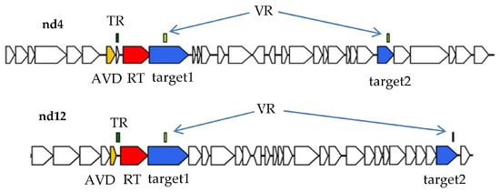 DGR cassettes from the nd4 and nd12 genomes generated using myDGR service. Target genes are colored in blue, reverse transcriptase (RT) genes are red, accessory protein AVD genes are orange. TR—template repeat, VR—variable repeat.