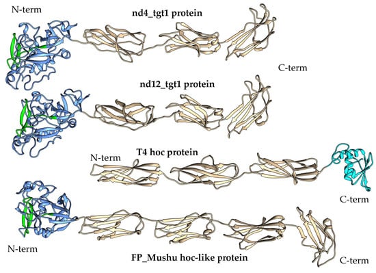 The presence of Ig-like domains indicated a possible structural similarity of the nd4_tgt1 and nd12_tgt1 proteins with the capsid-embedded Hoc-protein of the phage T4 (Figure 3) and some phage proteins containing Ig-like domains [,]. Moreover, similar proteins have been also mentioned as Hoc-like targets in DGR cassettes of the prophages FP_Mushu and FP_Brigit found in Faecalibacterium prausnitzii []. However, nd4_tgt1 and nd12_tgt1 proteins have some differences compared to the T4 Hoc-protein. According to the AlphaFold model [], the Hoc protein of the T4 phage does not contain globular N-terminal lectin domain and the structure of the C-terminal capsid-anchoring domain is also different. Modeling using AlphaFold2 showed that the Hoc-like proteins of the FP_Mushu and FP_Brigit phages have a topology more similar to that of the nd4_tgt1 and nd12_tgt1 proteins than the T4 Hoc. The Hoc-like proteins of the FP_Mushu and FP_Brigit phages also have a C-lec domain at their N-termini; however, it is followed by four Ig-like domains instead of three (Figure 3). Importantly, the aa sequence similarity of the nd4_tgt1/nd12_tgt1 proteins and the Hoc-like proteins of the FP_Mushu and FP_Brigit was low despite the similar topology. The overall protein identity for these four proteins was ~7%; however, the last ~100 aa residues forming the C-terminal Ig-like domain (Cterm_Ig domain) showed identity of ~17%. Thus, we assume that the more conserved Cterm_Ig-like domain is involved in the embedding of the tgt1 protein into the phage virion, whereas the N-terminal C-lec domain is used for binding to some receptors.