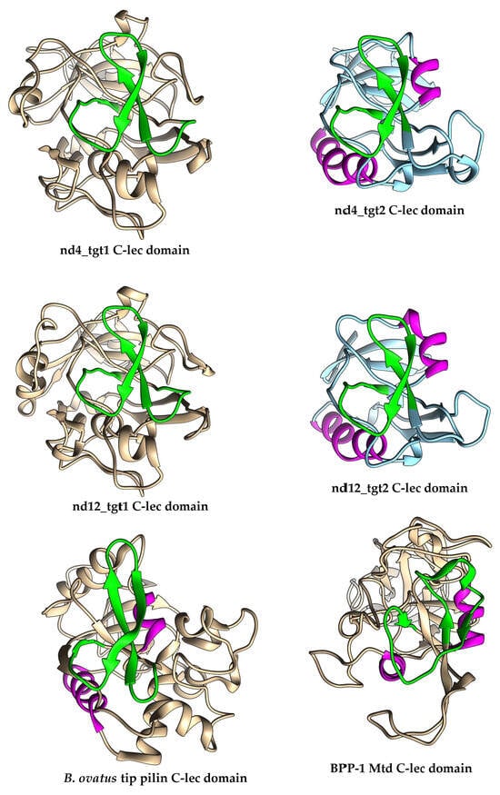 Ribbon representation of predicted 3D structures of C-lec domains of the nd4_tgt1, nd4_tgt2, nd12_tgt1, and nd12_tgt2 proteins. Experimental structures of C-lec domains of the BPP-1 Mtd protein (pdb 1YU0) and tip pilin of Bacteroides ovatus (pdb 4EPS) are shown for comparison. VR-encoded regions are marked with green. Highlighted alpha-helices indicate similar orientation of the molecules. Three-dimensional models were predicted using AlphaFold2, structure relaxation performed using GROMACS, and final models were rendered using UCSF Chimera.