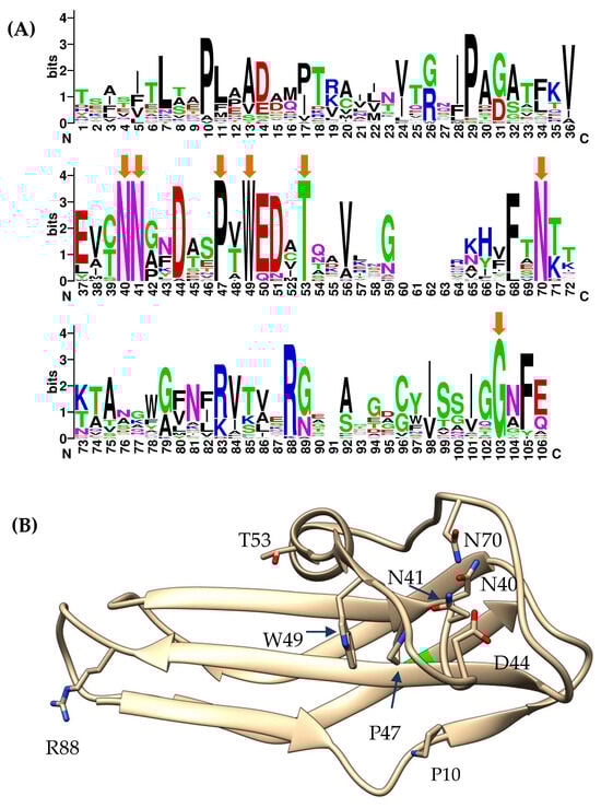 Conserved residues of the Cterm-Ig domain. (A) Weblogo (weblogo.berkley.edu, accessed on 1 October 2023) diagram representing consensus sequence of the Cterm-Ig domain of 29 selected proteins containing this domain. Orange arrows indicate 100% conserved aa residues. (B) Ribbon view of predicted nd12_tgt1 Cterm-Ig domain structure. Residues are numbered according to Weblogo diagram.