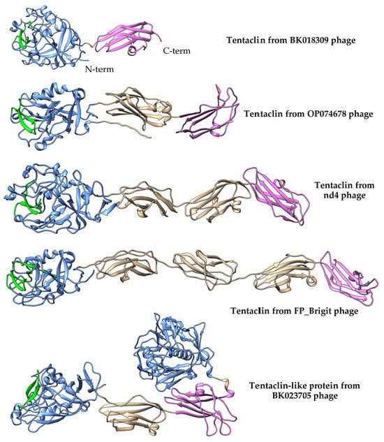 So, a large group of phage proteins was discovered. Since all of them contained a C-lec domain at the N-terminus, and the vast majority of C-lec domains bind polysaccharides or proteins [], these proteins are probably receptor-binding ones. In addition, these proteins contain the Ig-like domains that are connected by unstructured regions; so, the proteins are possibly flexible like the muscle protein titin [] or bacterial adhesins—invasin and intimin []. Taking into consideration the prevalence of such proteins and their possible flexibility, these proteins were named tentaclins after (TENTACLe + proteIN). Despite a certain size variability, the specific features of tentaclins are the presence of the N-terminal C-lec domain with the characteristic beta-hairpin structure and several Ig-like domains with the C-terminal domain containing a particular consensus (Figure 5 and Figure 6).