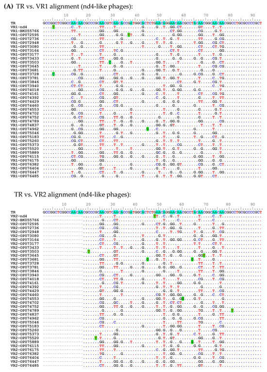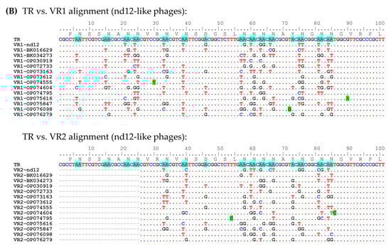 Alignment of nucleotide sequences of TR vs. VR1 and TR vs. VR2 for nd4-like (A) and nd12-like phages (B). Adenines of TR sequences susceptible to mutagenesis are highlighted in blue. Unusual substitutions arising from nucleotides other than A are highlighted in green. The amino acid sequence is shown above the TR sequence. Alignments were generated using ClustalW multiple alignment algorithm.