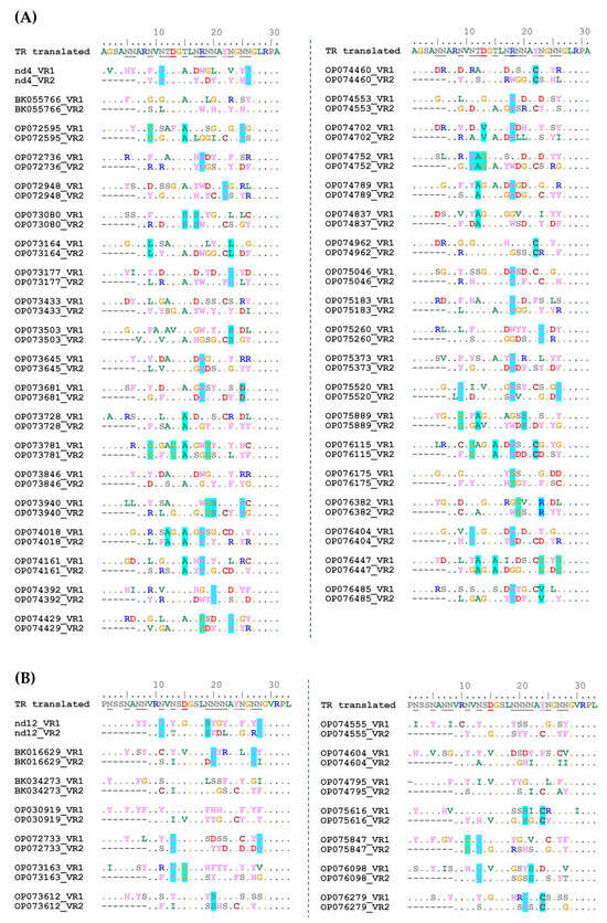A total of 54 putative phage genomes with TR sequences identical to that in the nd4 genome were selected from the GenBank Nucleotide collection (nt) database. Analysis using VIRIDIC indicated that these phages probably belong to the same genus (intergenomic similarity > 87%). Only 39 of 54 genomes contained DGR cassettes with two target genes (Figure 9). TR in the nd4-like genomes contains 25 adenines (Figure 9). Of them, 24 positions were mutated in VR1 (in the target1 gene) in at least one of the nd4-like genomes (Figure 9). As a result, 13 aa were substituted in the tentaclin of nd4. In other nd4-like phages, from 7 aa to 19 aa substitutions in their tentaclins were identified (Figure 10). As for VRs of the target2 genes, all 21 adenines could be mutated, as VR2 is shorter. So, eight aa were substituted in the nd4_tgt2 protein and from 6 to 13 substitutions were found in the orthologous proteins of nd4-like phages (Figure 10).