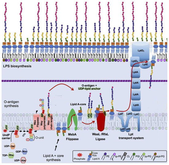 Model of lipopolysaccharide (LPS) synthesis with Wzy-dependent O-polysaccharide (OPS) polymerization and LPS transportation to the outer membrane in enterobacteria. LPS molecules are synthesized from two precursors, lipid A-core molecules and OPS, generated by two independent pathways. Then, LPS is assembled by the ligation of O antigens to lipid A-core molecules. OPS synthesis begins at the cytosolic side of the inner membrane (IM) by a sequential transfer of monosaccharide residues from sugar-nucleotide donor molecules to the undecaprenyl phosphate carrier (Und-PP) lipid to form a Und-PP-linked O unit. The Und-PP-O units are then flipped to the outer IM leaflet, polymerized by the Wzy OPS polymerase under the control of the Wzz protein regulating OPS chain length. Lipid A-core biosynthesis begins in the cytoplasm and continues in parallel with OPS synthesis at the IM inner leaflet. Next, the O-antigen and lipid A-core structures are joined with WaaL, also known as RfaL, to form one LPS superstructure. The Lpt complex spans the dual bilayers of the envelope and drives unidirectional LPS transport across the periplasm. Modified from [15], Creative Commons Attribution 4.0 International License (http://creativecommons.org/licenses/by/4.0/ accessed on 6 November 2023)).
