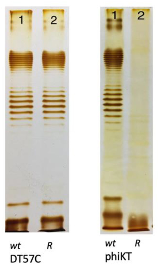 The LPS profiles of E. coli 4s mutants selected for resistance to a strategy I phage T5-like siphovirus DT57C and to a strategy II phage phiKT, a podovirus, distantly related to T7 (wt—wild type, R—resistant mutant). Images adapted from [12], Creative Commons Attribution 4.0 International License (http://creativecommons.org/licenses/by/4.0/ accessed on 6 November 2023).