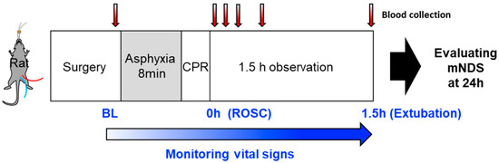 The experimental design and the timeline for blood sample collection and brain functional analysis are outlined in Figure 1. To minimize cardiac damage and its potential implications on brain function, we employed an 8 min mild cardiac arrest model [20]. On average, rats achieved ROSC within 1 min from the initiation of resuscitation and regained consciousness within 4 h after achieving ROSC.