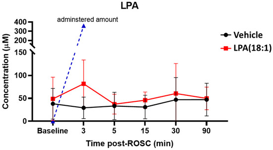 Changes in total lysophosphatidic acid (LPA) levels in plasma after CA and with LPA (18:1) supplementation. LPA concentrations do not change after CA (black). LPA levels after providing 10 mg/kg would be approximately 360 μM; however, post-CA plasma LPA levels only exhibit a slight increase after LPA administration and rapidly normalize to baseline levels (red). n = 2, ROSC; return of spontaneous circulation.