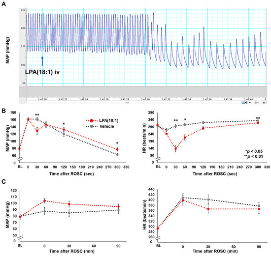 We subsequently evaluated the impact of LPA administration on hemodynamics by comparing blood pressure and heart rate between LPA (18:2)-treated rats and those treated with the vehicle. In both groups, baseline characteristics, including body weight, surgical procedure duration, vital signs before CA, time from asphyxia induction to CA, and the duration of cardiopulmonary resuscitation until ROSC, were similar, as outlined in Table 1.