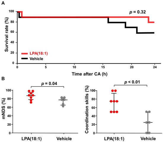 Beneficial effect of lysophosphatidic acid (LPA) administration on rat survival and neurological function after 10 min of cardiac arrest (CA). (A) Comparing survival rates between the LPA and vehicle groups for 24 h after cardiopulmonary resuscitation (n = 10 for each group). (B) Modified neurological deficit scores (mNDS) and the sub-points of the coordination skill in mNDS at 24 h after resuscitation for surviving rats in both groups. Differences between the groups were compared using the Mann–Whitney U test.
