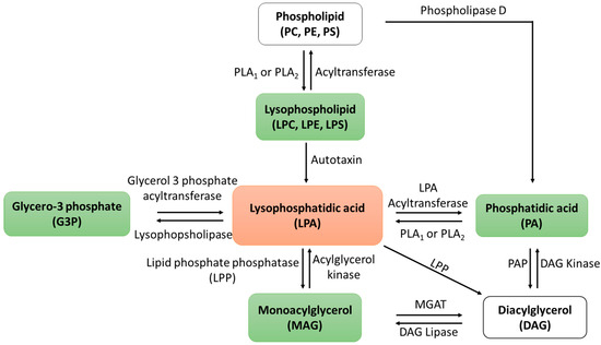 Lysophosphatidic acid metabolic pathways. The intricate metabolic pathways illustrate the rapid conversion of LPA into various lipid forms, underscoring the challenges in comprehensively studying the functional role of LPA.