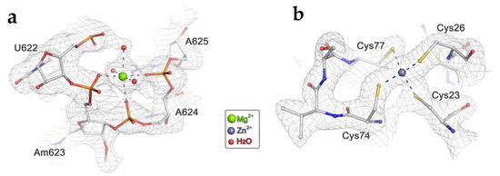 High-resolution features resolved in the 40S density map. (a) Fragment of the wheat 18S rRNA model, including a Mg2+ ion with octahedral coordination. (b) Zinc finger structure in the protein eS26 atomic model. The grey mesh depicts the electron density of the wheat 40S cryo-EM map.