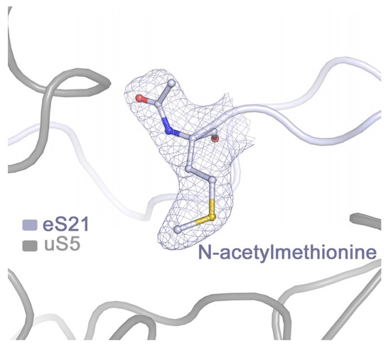 Modifications of ribosomal proteins in plants are mostly limited to initiator methionine removal, N-terminal acetylation, and phosphorylation [26,27]. Unfortunately, most N-termini of eukaryotic RPs are very flexible, and their electron density is absent or blurred in the cryo-EM map. We succeeded in proving the acetylation of only one N-methionine in the protein eS21 (Figure 6). Resolved electron density of 12 proteins started from the second amino acid, and for 9 of them, a tightly packed N-terminus allowed us to draw a valid conclusion on the post-translational methionine removal. As for phosphorylated serines, they are all located in C-terminal parts of RPs not resolved in the cryo-EM map.