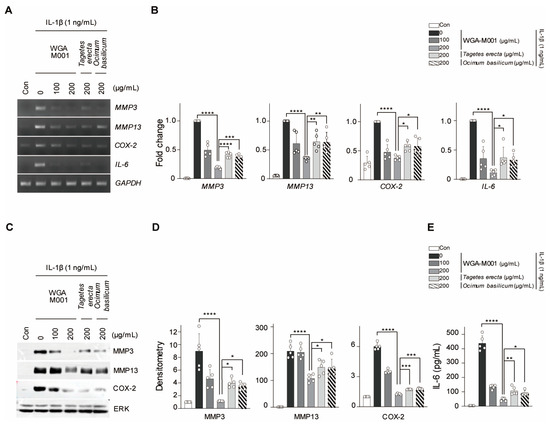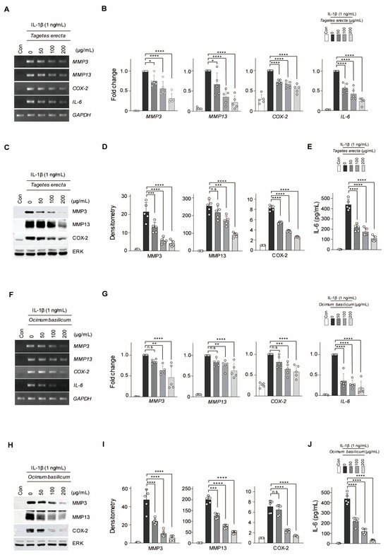 MMP3, MMP13, COX-2, and IL-6 were downregulated by Tagetes erecta and O. basilicum when co-treated with IL-1β in mouse articular chondrocytes. T. erecta or O. basilicum (50, 100, and 200 μg/mL) were used for co-treatment with IL-1β (1 ng/mL) in chondrocytes. (A,B,F,G) The mRNA relative expression levels of MMP3, MMP13, COX-2, and IL-6 were evaluated via reverse transcription–polymerase chain reaction (RT-PCR) and quantified by qRT-PCR (n = 5). (C,D,H,I) Protein levels of MMP3, MMP13, and COX-2 were detected using Western blot analysis and quantified by measuring relative intensities using densitometry. (E,J) IL-6 production was measured using ELISA. Transcription and protein levels were normalized to those of GAPDH or ERK, respectively. Data are represented as mean ± standard deviation (SD) as results of analysis by one-way analysis of variance (ANOVA) with Dunnett’s multiple comparisons test (n = 5). * p < 0.05, ** p < 0.01, *** p < 0.001, **** p < 0.0001, and n.s = not significant.
