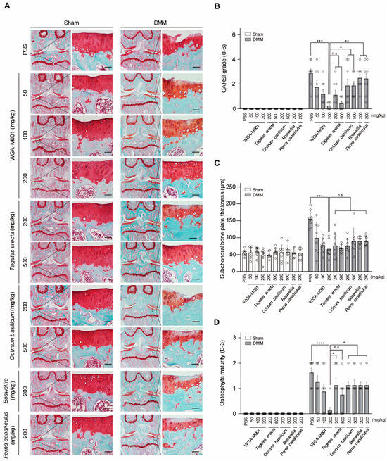 Oral administration of WGA-M001 reduced cartilage destruction in the DMM-induced OA mouse model (n = 8). Mice were treated with WGA-M001 (0, 50, 100, and 200 mg/kg), T. erecta (200 and 500 mg/kg), and O. basilicum (200 and 500 mg/kg) every day for 10 weeks. (A) The degree of cartilage destruction was analyzed using Safranin O staining (scale bar = 100 μm). To evaluate the degree of OA symptoms, OARSI grade (B), osteophyte maturity (C), and subchondral bone plate (D) were measured. Values are presented as mean ± SD and were assessed using the Kruskal–Wallis test followed by Dunn’s multiple comparisons test. * p < 0.05, ** p < 0.01, *** p < 0.001, **** p < 0.0001, and n.s = not significant.