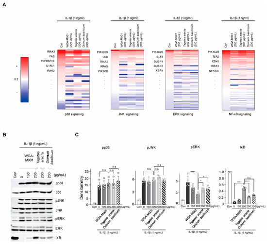 To demonstrate that we demonstrated that WGA-M001 has an inhibitory effect on catabolic factor expression, compared to T. erecta and O. basilicum treatment through inhibition of ERK and NF-κB pathway, RNA-seq analysis was performed to examine the regulation of the signaling pathways. NF-κB and MAPK (ERK, Jun N-terminal kinase (JNK), and p38) signaling pathways were primarily associated with the IL-1β signaling pathway [7]. In silico analysis was performed to determine the pathways through which T. erecta, O. basilicum, and WGA-M001 regulate OA. Alterations in the expression patterns of genes related to each pathway mediated by WGA-M001, T. erecta, and O. basilicum were analyzed. A list of genes involved in each signaling pathway was derived using Ingenuity Pathway Analysis (IPA) [44]. Alterations in expression patterns are presented as a heatmap (Figure 4A). Only genes related to each pathway whose expression was upregulated by IL-1β have been presented. Moreover, the expression patterns of WGA-M001, T. erecta, and O. basilicum were analyzed. Among the genes whose expression increased in the presence of IL-1β, we analyzed the number of genes whose expression increased to a greater degree following co-treatment with WGA-M001 compared to the increase associated with treatment with T. erecta and O. basilicum (Figure 4A). A total of 57 out of 72 genes related to the NF-κB signaling pathway and 59 out of 81 genes associated with ERK signaling were downregulated by WGA-M001, compared to the expression levels associated with other substances (Figure 4A). The results suggested that WGA-M001 blocked NF-κB and ERK signaling pathways, but not the other signaling pathway. We also investigated whether protein expression levels correlated with the heatmap outcomes (Figure 4B). As shown by the heatmap, the protein level of NF-κB and pERK was downregulated in the presence of WGA-M001 to a larger extent than the downregulation of the others (Figure 4C).