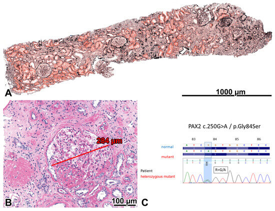 The glomeruli were sparsely distributed and markedly enlarged, and they exhibited an FSGS lesion characterized by an occasional perihilar location, subendothelial hyaline deposits, and insudation of IgM and C3 on IF. Severe interstitial fibrosis and tubular atrophy, interstitial foamy cells, and eccentric subendothelial hyalinosis in afferent arterioles accompanied the glomerular lesions. The quantitative values of glomerular size and glomerular paucity supported our observational findings. One patent glomerulus was examined electron microscopically. Diffuse FPE was not seen. The GBM appeared to be diffusely thickened, with a mean value of GBM width determined by 16 direct measurements. The lamina rara interna spaces were segmentally widened, and a thin subendothelial basement membrane with occasional interposed mesangial cell processes was observed in a few capillary loops. The changes were interpreted as a consequence of altered intraglomerular hemodynamics. The endothelial cells were fenestrated (Figure 1A–C). Two conditions were considered in a differential diagnosis. One was oligomeganephronia of adult-onset type [6,7], which is a very rare entity and sometimes may be caused by PAX2 mutations [6,8]. The other entity was obesity-related adaptive FSGS [1,9]. Because the genotyping procedure demonstrated a heterozygous missense mutation in exon 3 of the PAX2 gene, the case was concluded as a PAX2-mutation-induced adult-onset oligomeganephronia and adaptive FSGS (FSGS7, OMIM: 616002), noting that severe obesity could contribute to the progression of kidney injury. The mutation did not shorten the length of the PAX2-protein (https://www.mutationtaster.org, last accessed on 15 October 2023).
