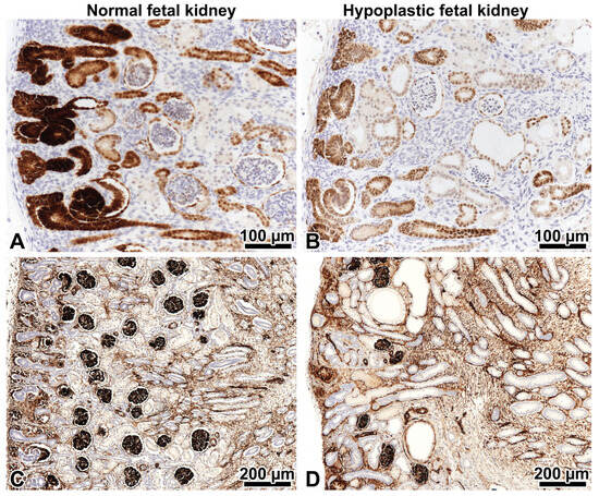 PAX2 and WT1 immunohistochemistry in fetal kidneys on strictly orthogonal cortico-medullary sections. Left: control kidney, right: hypoplastic kidney at 21 weeks gestation. (A,B) The expression of the PAX2 protein in the nephrogenic zone involves the cap mesenchyme, ureteral epithelium, and early nephron elements. The podocytes of mature glomeruli beneath the nephrogenic zone are negative. Note that the PAX2 expression is less intense in the hypoplastic kidney. This tells us it is abnormal. ×20. (C) Five to six generations of WT1-positive glomeruli beneath the nephrogenic zone in the control kidney. ×10. (D) Only 2–3 generations of WT1-positive glomeruli in the hypoplastic kidney are present. ×10.
