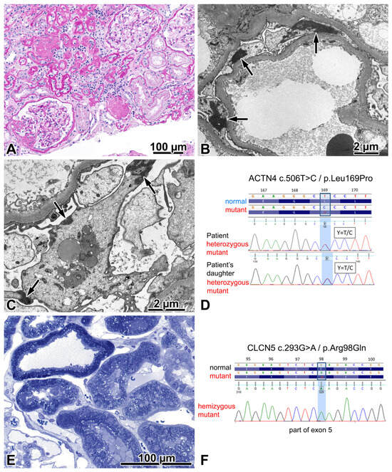 The podocytes and the apical endocytic–lysosomal apparatus of proximal tubules were re-examined electron microscopically to look for suggestive mutational abnormalities. Distinct electron-dense aggregates in podocyte cell bodies were found (Figure 3B,C). The small and large vesicles and dense tubules of apical endocytic apparatus in the proximal tubules looked normal (Figure 3E), and tubular calcium deposits were not observed histologically. Beta-2-microglobinuria was checked clinically and gave a negative result. The case was concluded as an ACTN4-mutation-induced familial FSGS (FSGS1, OMIM: 603278), and the CLCN5 mutation was classified as benign. His kidney function slowly deteriorated, and 4 years after the renal biopsy evaluation, chronic hemodialysis treatment was initiated.
