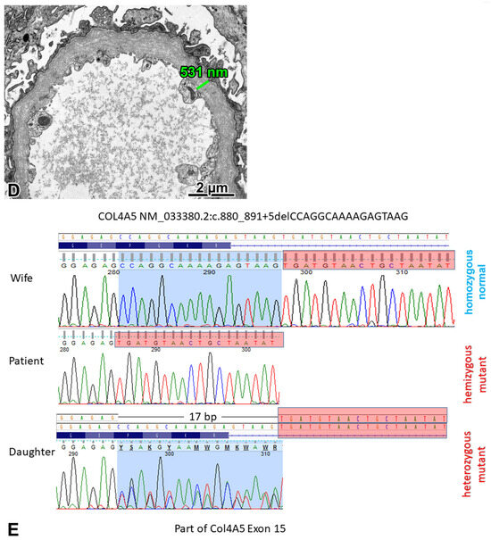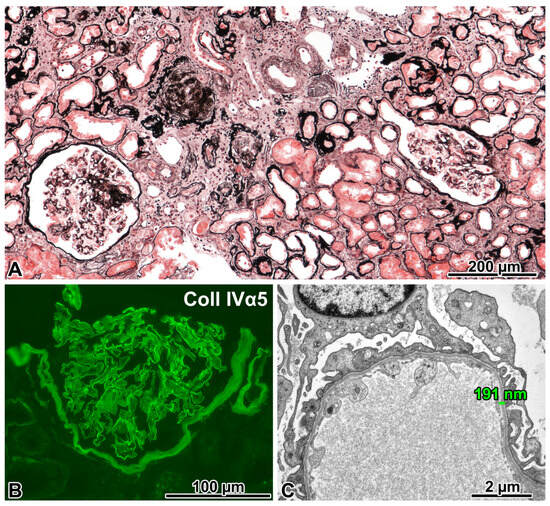 Pronounced chronic sclerosing changes, and an FSGS not otherwise specified variant in patent glomeruli, mild glomerulomegaly, and interstitial foamy cells were observed light microscopically (Figure 4A). The IF evaluation was negative for immune complexes. The antibody cocktail against the α5 chain stained the GBM (Figure 4B), the basement membrane of Bowman’s capsule, and some of the tubules. Three glomeruli were examined electron microscopically. Two exhibited diffusely thinned GBM (Figure 4C). In the third one, the basket-weave appearance of GBM was noted (Figure 4D). The FPE was focal. Because the EM findings strongly suggested Alport syndrome, the patient was investigated for extrarenal manifestations. Bilateral hypoacusis was diagnosed shortly after the renal biopsy. No Alport-related ocular changes were found. Regarding family involvement, the urinalysis performed on the patient’s daughter revealed microhematuria (Figure S1C). The patient is now close to end-stage renal disease 4.5 years after the kidney biopsy evaluation.